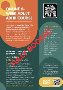 We have a new 6-week online ADHD course running from Thursday 30th April - Thursday 4th June, 7pm - 8.30pm. The course will be facilitated by Certified ADHD Life Coach & Co-Director of Procrastination Station CIC, Clair Simpson.